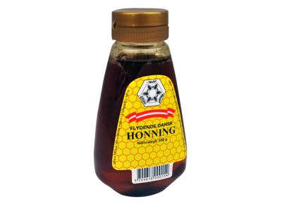 Flydende dansk honning, 350 g. Holder sig flydende i en periode, evt. krystallisering kan opløses ved at sætte glasset i 50 gr. varmt vandbad.