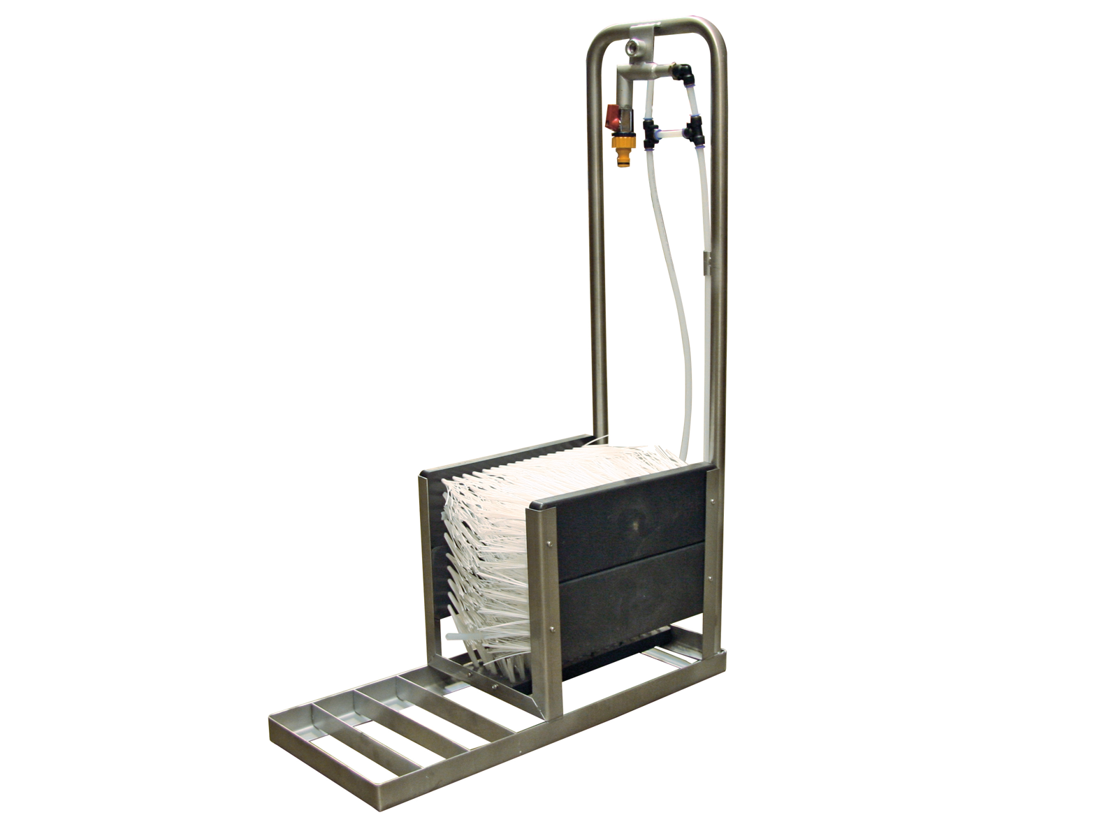 Boot washers Must be fixed to the floor or wall. Water pressure driven. Water is sprayed in from the bottom and sides.
