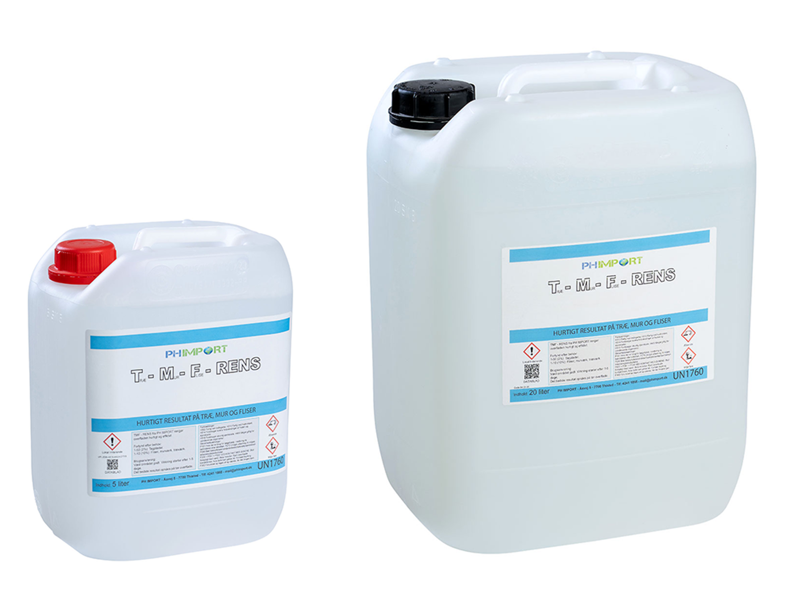 TMF clean TMF RENS (Wood, wall and tile cleaner) cleans the surface, simply by spraying it on in the correct mixture, letting it sit, and letting the sun and rain do the rest. After a short time, the process is underway, and perfect results are achieved after a few days. (Often a few hours). Mixture 1-10 is most often used. 20 liters is enough for approx. 2000 sq m.