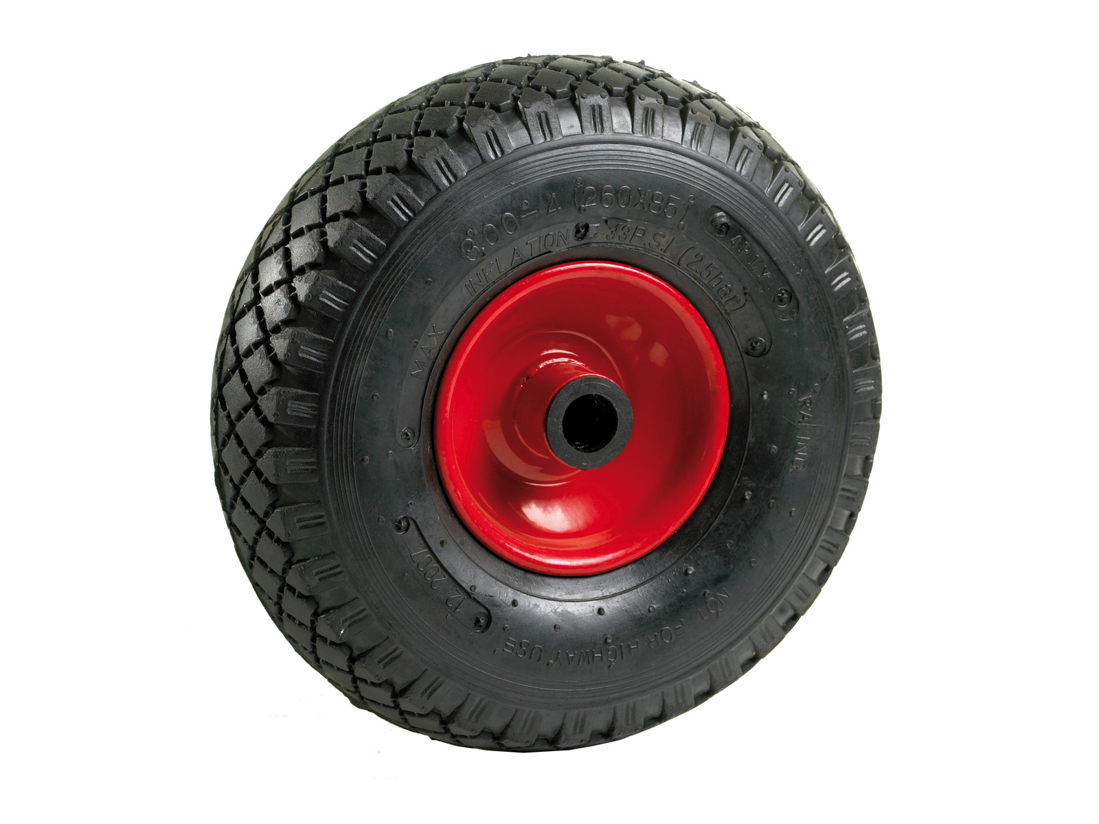 Air rubber wheelsPneumatic tire 3.00 x 4, hub: 20 x 75 mm, steel rim with roller bearing.Load capacity = 150 kg.