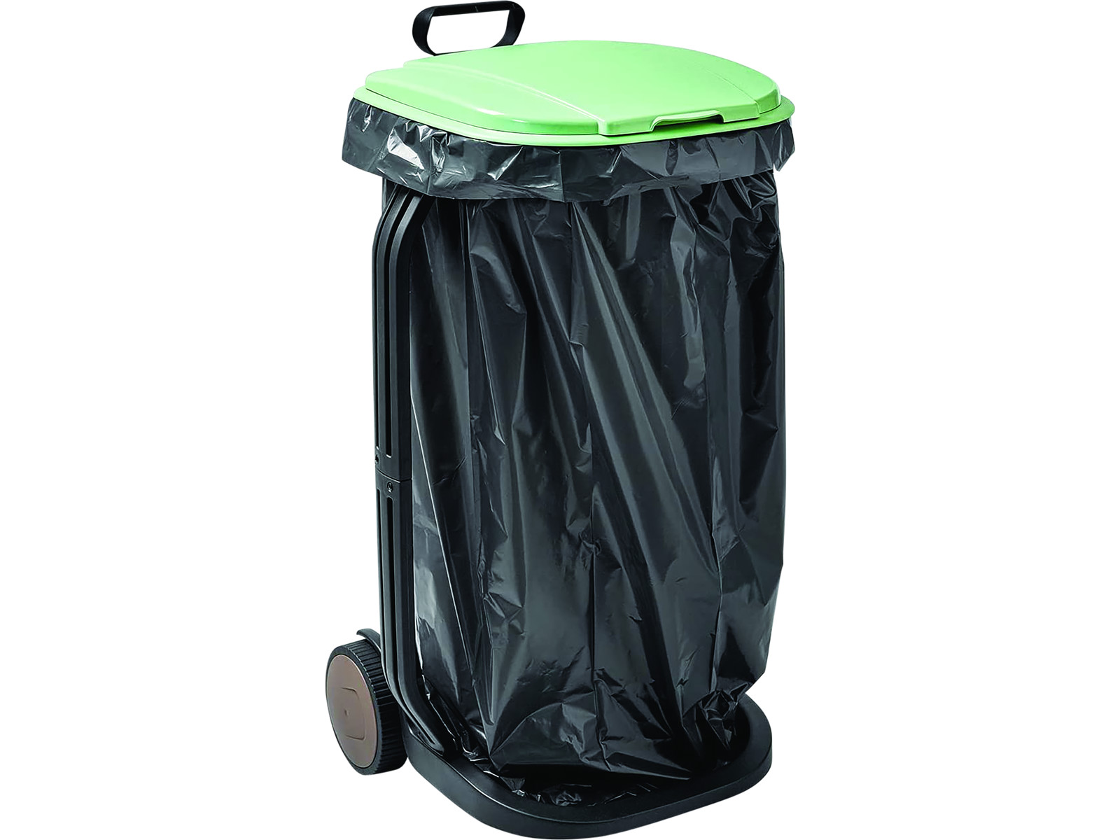 Waste rack Light and mobile waste rack made from 70% recycled plastic. The stand has a handle, two wheels and a lid with a frame that holds the waste bag firmly in place. The stand is assembled easily, without the use of tools.