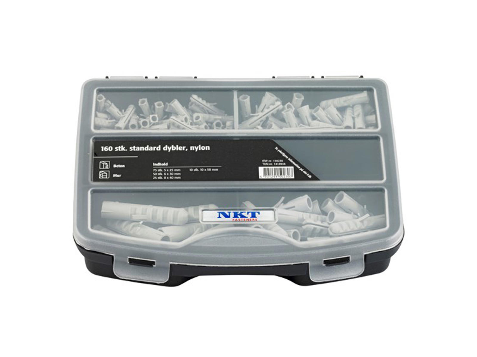 The assortment box contains 160 pieces. standard dowels: 75 pcs. of 5x 25 mm 50 pcs. of 6x 30 mm 25 pcs. of 8x 40 mm 10 pcs. of 10x 60 mm