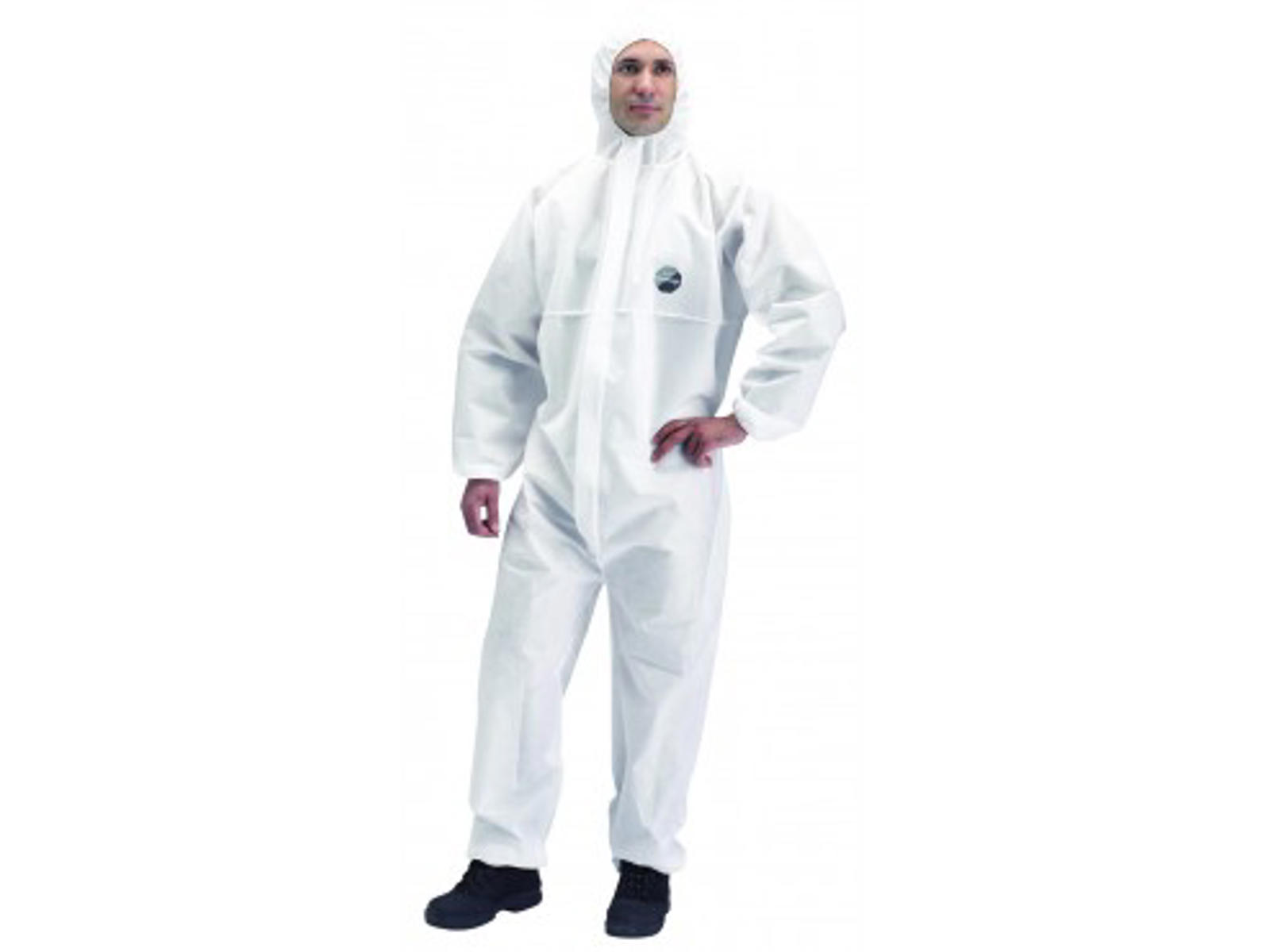 Made of 4-layer material (SMMS). Protects against particles and some liquid chemicals. Breathable and antistatic treated. Elastic in hood, at sleeves and ankles.