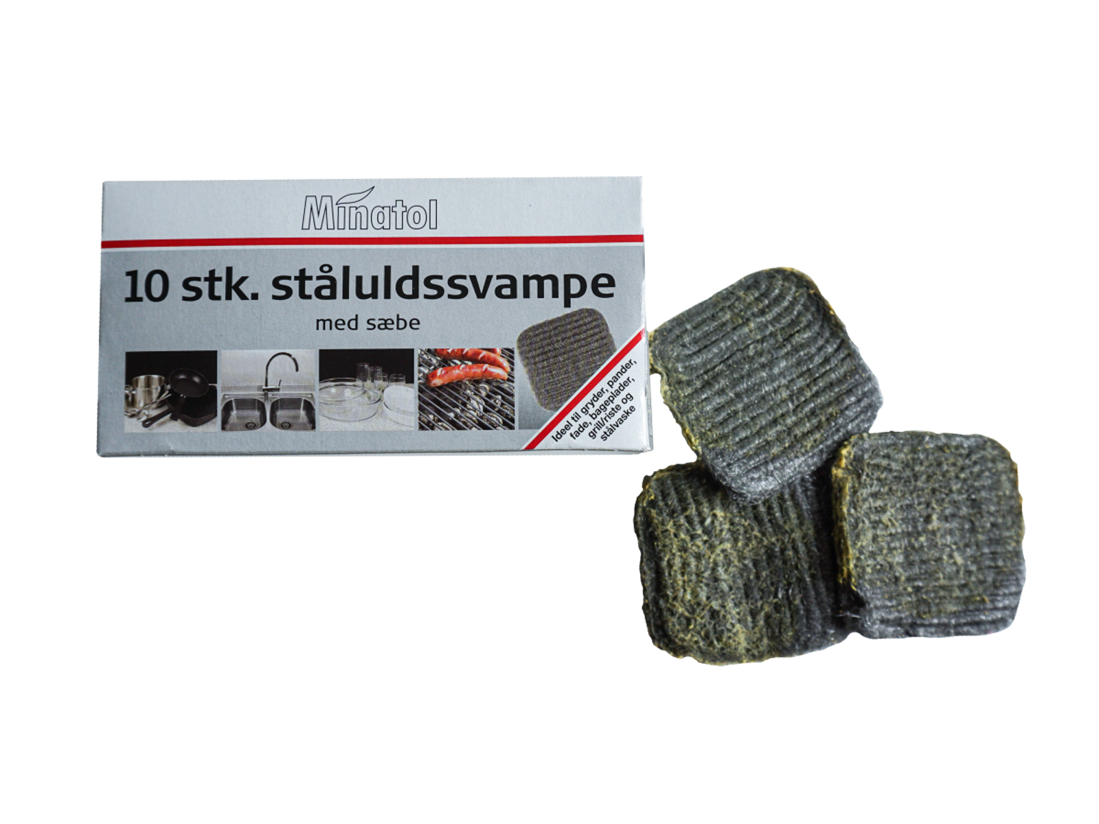 Steel sponges, 10 pcs. Steel wool sponges with soap 10 pcs. For cleaning e.g. steel sinks, pots and pans. Replace the sponge when it stops foaming. Steel wool sponges should not be used for polished surfaces, e.g. steel, aluminium, copper and for kitchen equipment with plastic coating such as Teflon, enamelled, painted and lacquered surfaces.