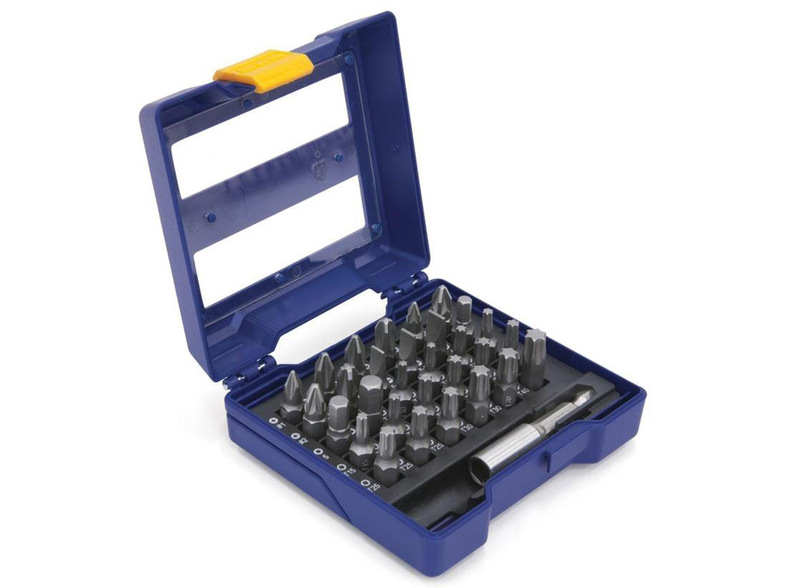 Bit set, 31 pieces, Irwin Philips, Pozidriv, straight slot, hexagon, Torx and bit holder in a practical and clear cassette. Contents: PH1, 2 x PH2, PH3, PZ1, 2 x PZ2, PZ3, SL4-5, SL6-8, SL8-10, HEX4, HEX5, HEX6, 2 x T10, 4 x T15, 4 x T20, 3 x T25, 2 x T30, T40 and bit holder.