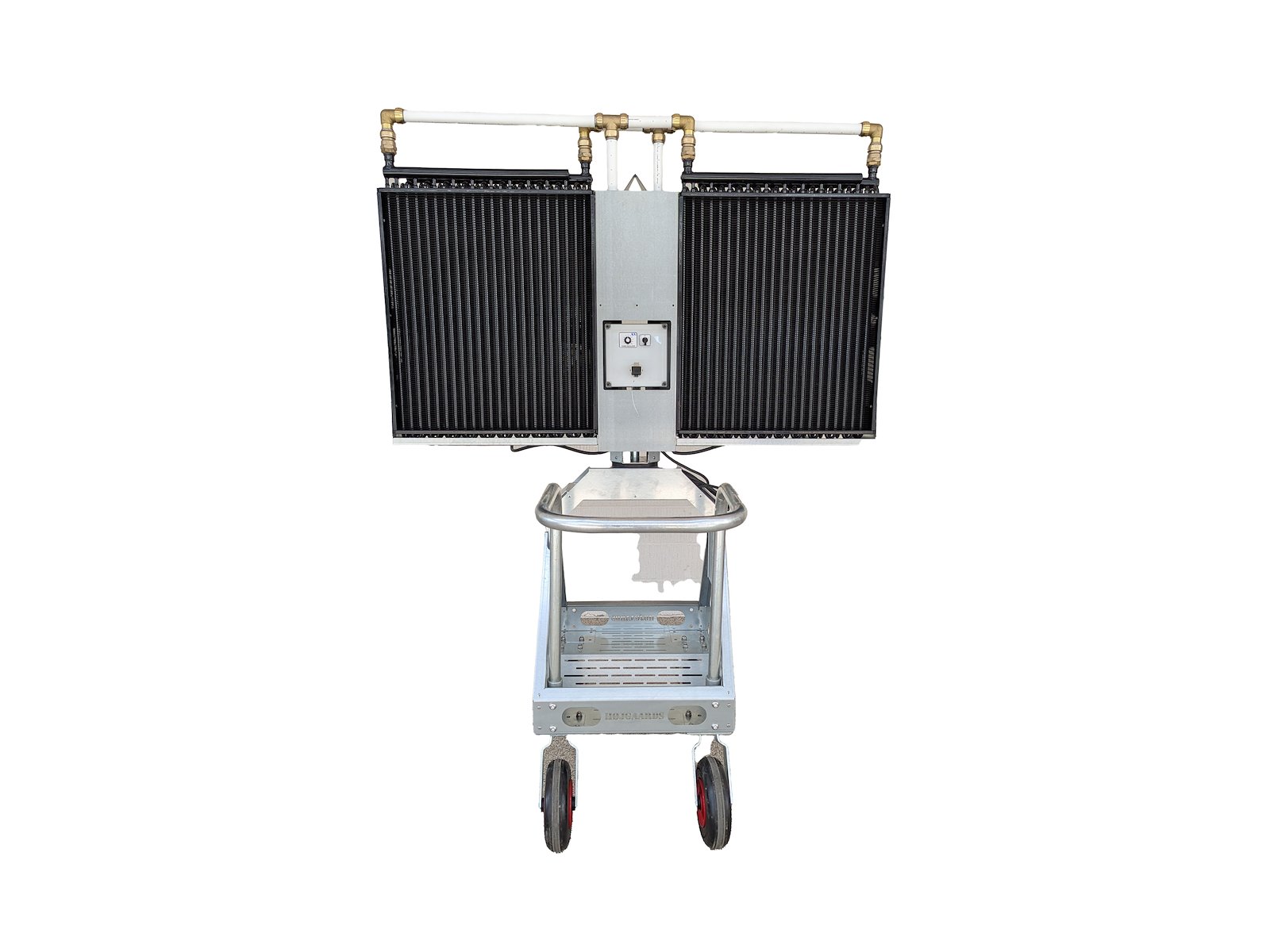 Fan heater Mobile heating fan. Adjustable height on cart, so fan can rotate above inventory height. Cart with puncture-proof wheels, developed for narrow aisles. (Width 58 cm and length 75 cm) Adjustable fan speed, thermostat operation and solenoid valve can be purchased. Heater with special surface treatment and good cleaning options due to the large fin spacing.