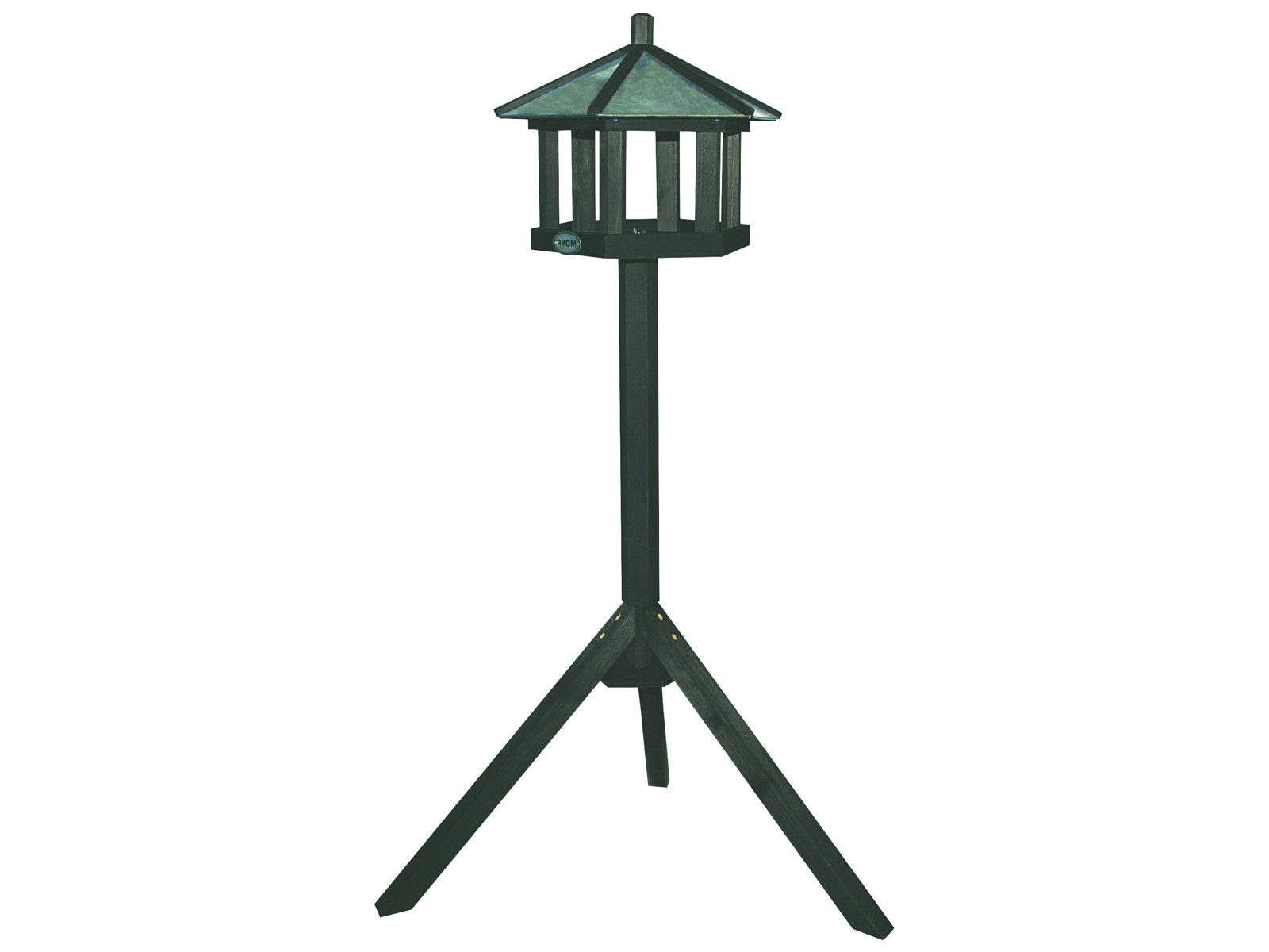 Bird feeder with zinc roof and footDiameter 30 cm, height 128 cm.Stained pine wood. Hexagonal with zinc roof.Incl. foot.