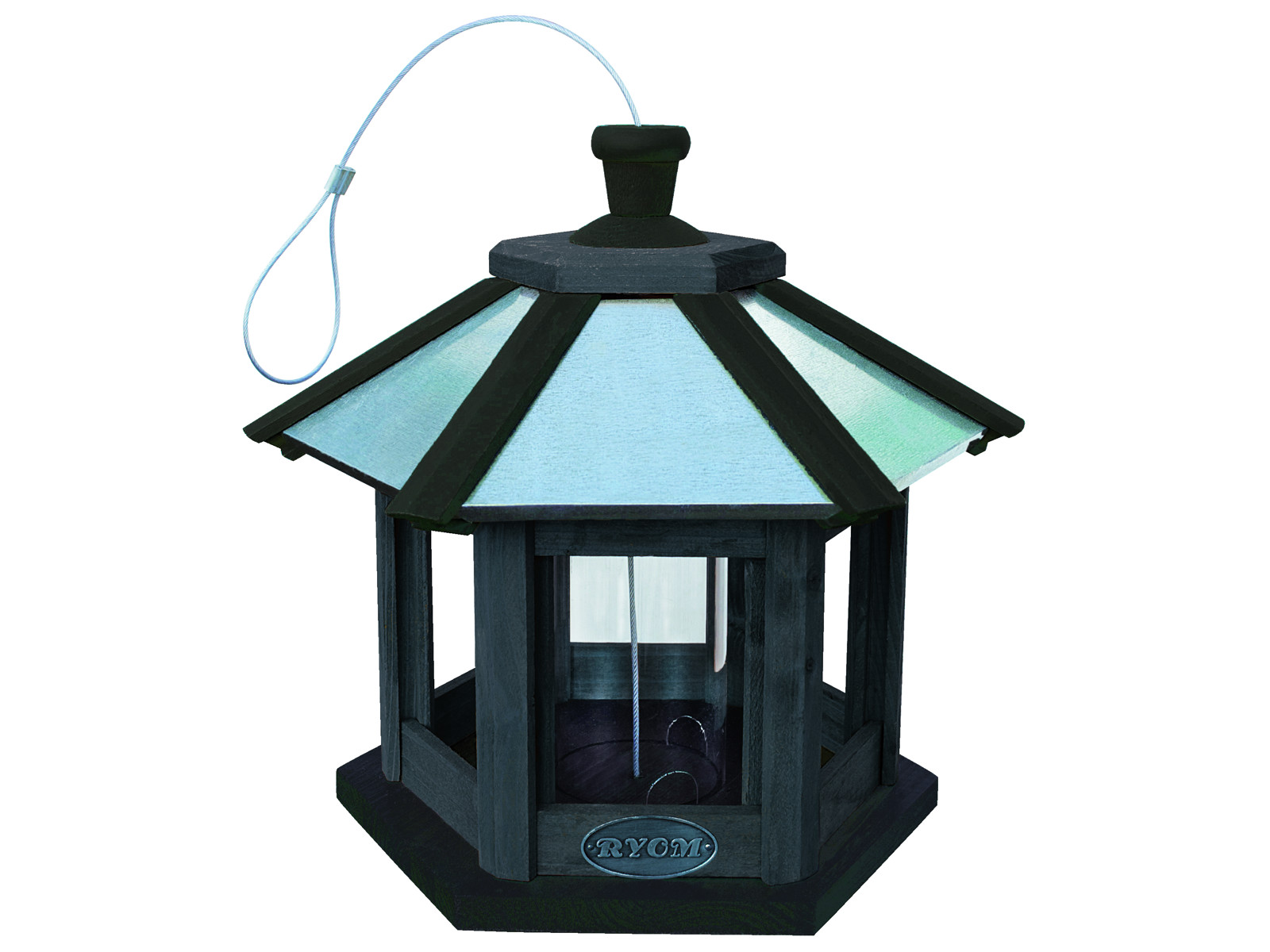 Bird feeder for hanging 6-sided bird feeder for seed and wild bird mix. Stained pine, plastic insert and zinc roof with wire for suspension. Height 34 cm. Length 29 cm. Width 29.5 cm.