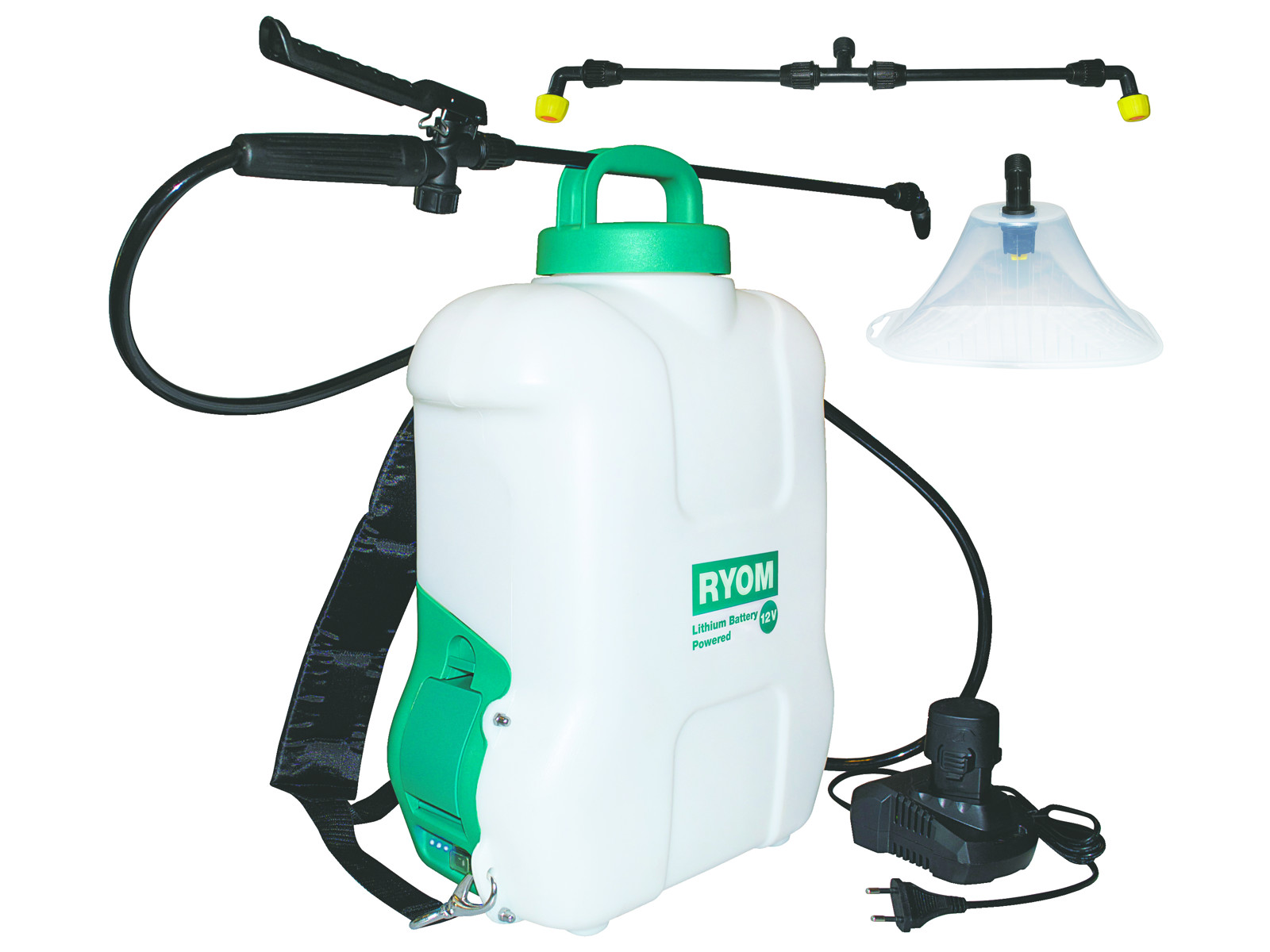 Electric sprayer with lithium battery 16L Backpack sprayer with 12 volt lithium battery 2500 mAH, and charger. There is a battery indicator, Y-valve handle with dirt filter, spray shield and spreading boom with 2 nozzles. Comfortable baby carrier. Charging time approx. 180 min. Working time approx. 181 min.