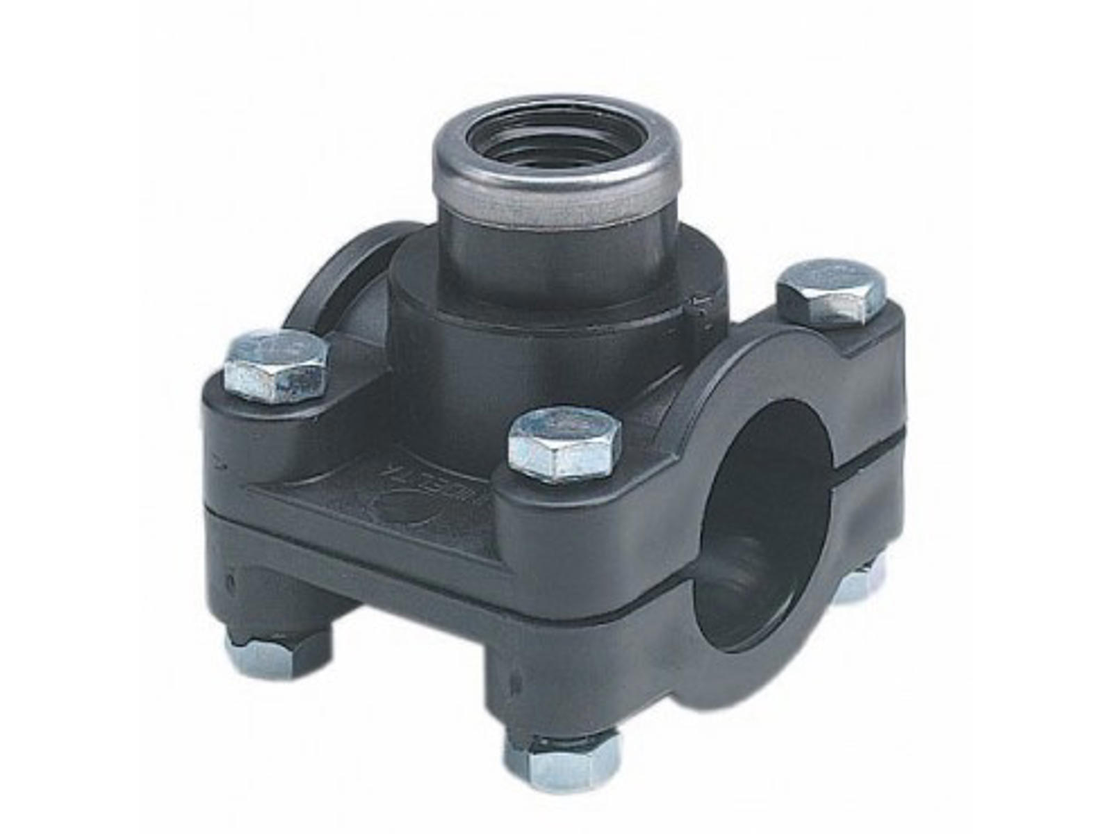 PVC Drilling hangers Polypropylene tapping clamps with galvanized steel bolts and stainless reinforcing ring. Working pressure: 10 bar.