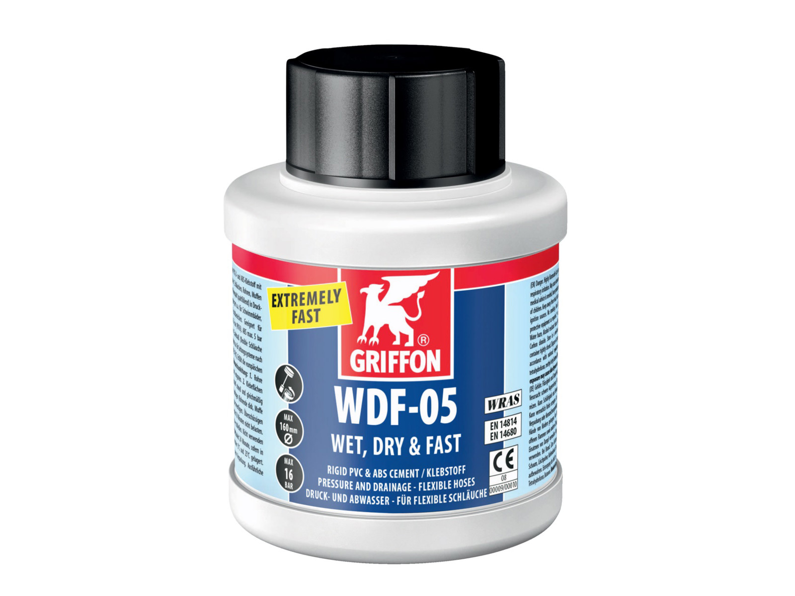 PVC Pipe Glue, 250 ml Griffon WDF-05 is a very fast-drying gap-filling PVC glue for pressure and drainage systems up to 160 mm that can be used in damp conditions. WRAS drinking water approved. Always use cleaning fluid before gluing.