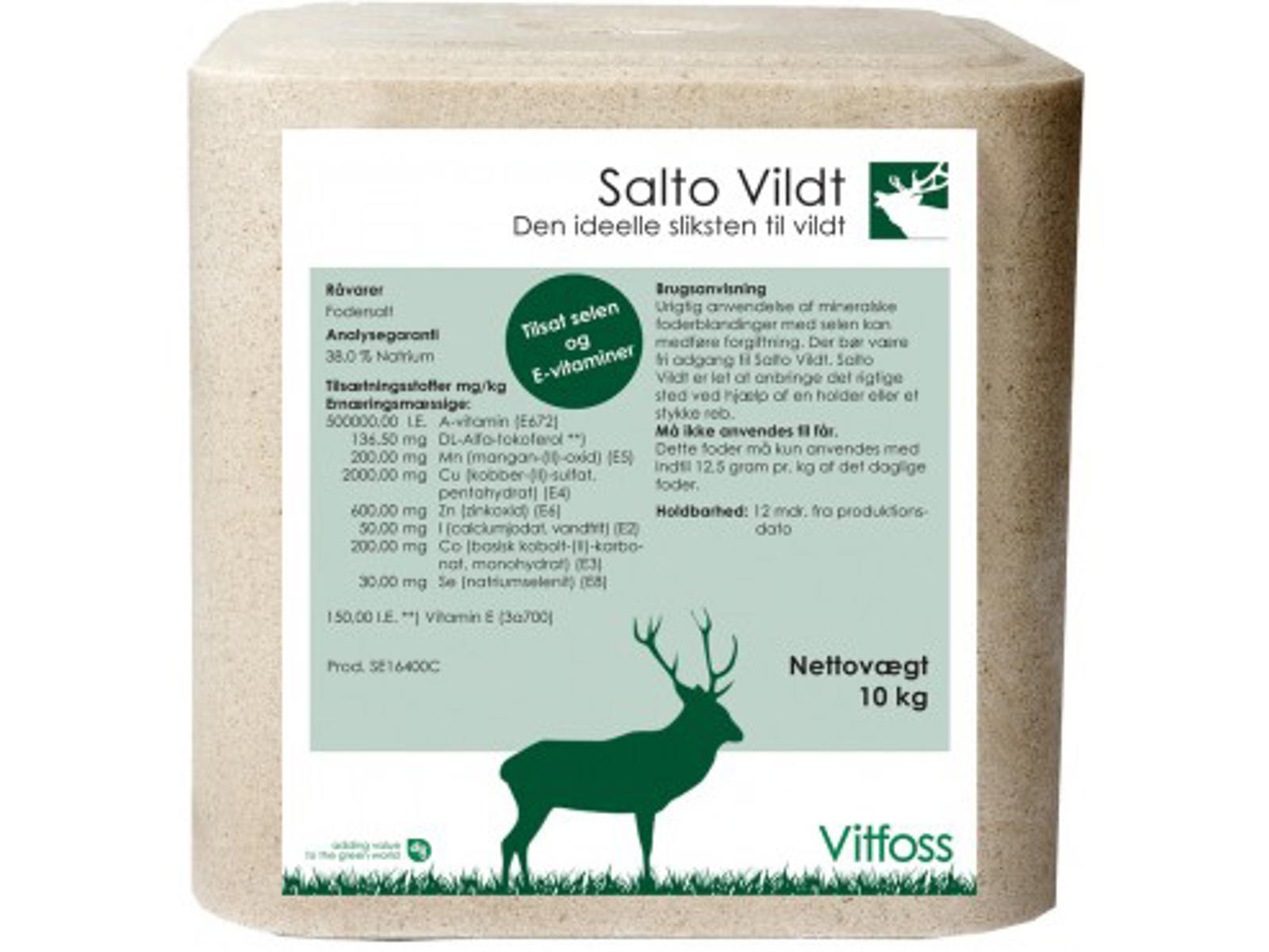 Salto Vildt is produced using a special high-pressure method, which makes them durable in handling as well as in rain. The product consists of natural mountain salt with added microminerals. Salto Vildt contains extra copper, selenium, vitamin A and vitamin E to counteract deficiency symptoms, as well as keeping the animals fresh. Salto Vildt also contains selenium, which the Danish soil is poor in. The product may possibly tied to a tree. 10 kg.