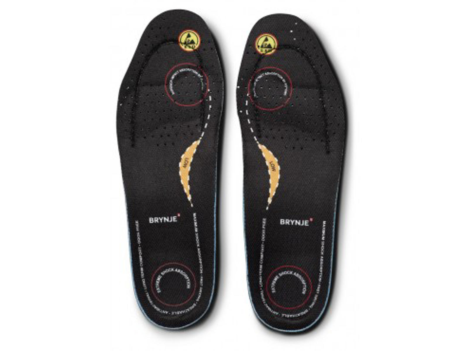 Sole Brynje ULTIMATE FOOTFIT Exclusive and arch-supporting insoles made of molded TPU and soft EVA foam with 3 mm Poron for extra shock absorption. The soles are breathable, antibacterial, sweat absorbent and provide extra good support around the heel and forefoot. The soles can be cut to fit most shoes. The soles are ESD approved and developed for 3 arch types.