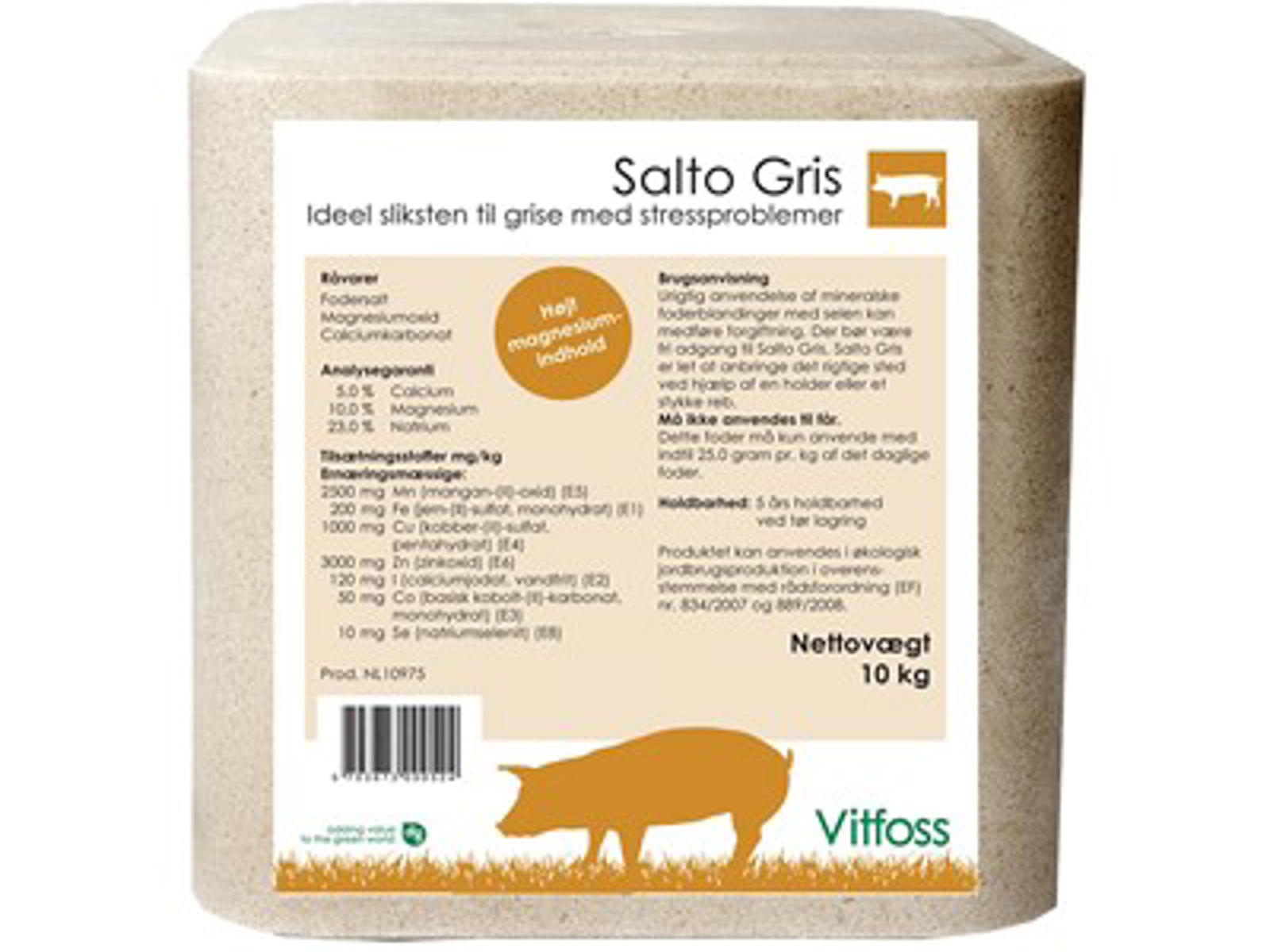 Candy Stone Salto Pig Salto Sliksten consists primarily of salt with added micro-minerals. Salto Gris weighs 10 kg and is shaped like a cube. The hole in the middle makes it easy to place the stone in the right place using a holder or a piece of rope. We recommend that there is free access to Salto Sliksten. Salto Gris has added calcium and magnesium. The high content of magnesium has a stress-relieving effect. 10 kg
