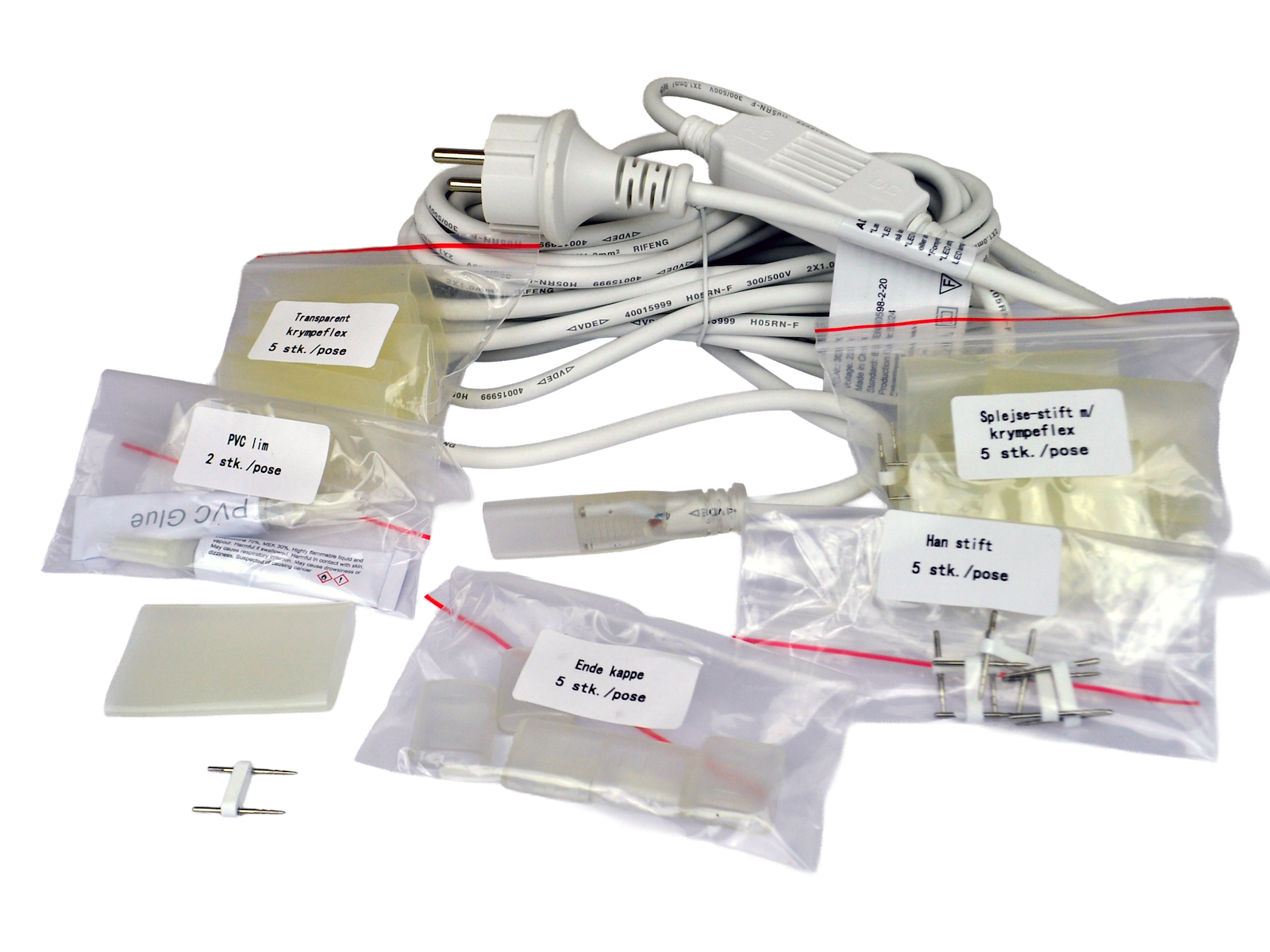 Installation kit for LED strip Bandit Installation kit for item no. 3026K and 3027K. Consisting of: 1 pc. Power supply (driver) 0.5m + 8m H05RN-F 2x1.0mm2. 2 pcs. tube PVC glue for joints. 5 pcs. End caps for closing the strip after cutting. 5 pcs. Joint caps. 5 pcs. Splice pin with sleeve. 1 pc. male connector for driver/strip connection.