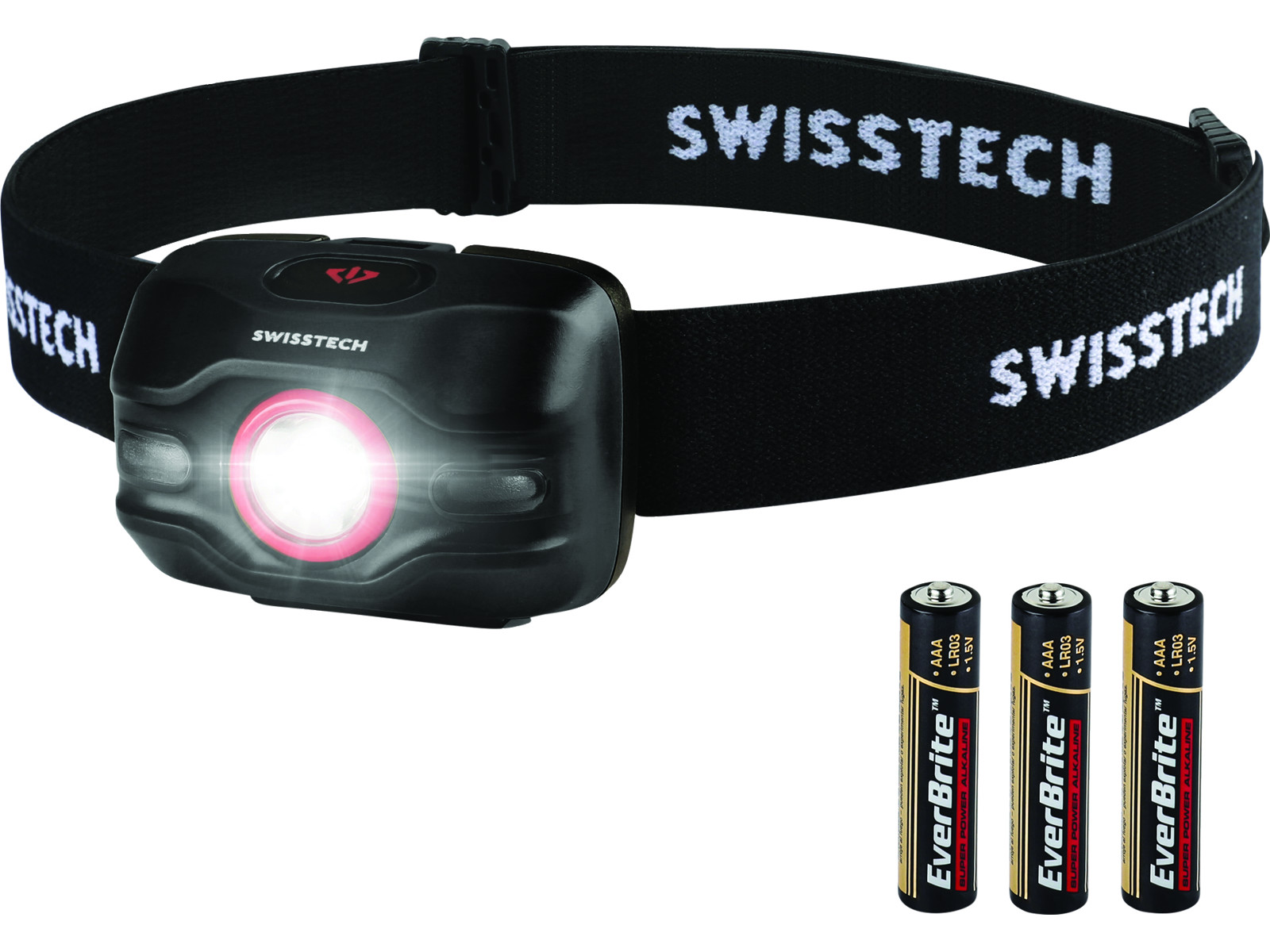 Battery-powered LED headlamp from Swiss+Tech with elastic band that can be adjusted in size so that the lamp can be adapted to the individual user. The headlamp uses 3 x AAA batteries (included), and has a max. performance of 250 lumens, which throws the light 80 meters forward into the landscape.