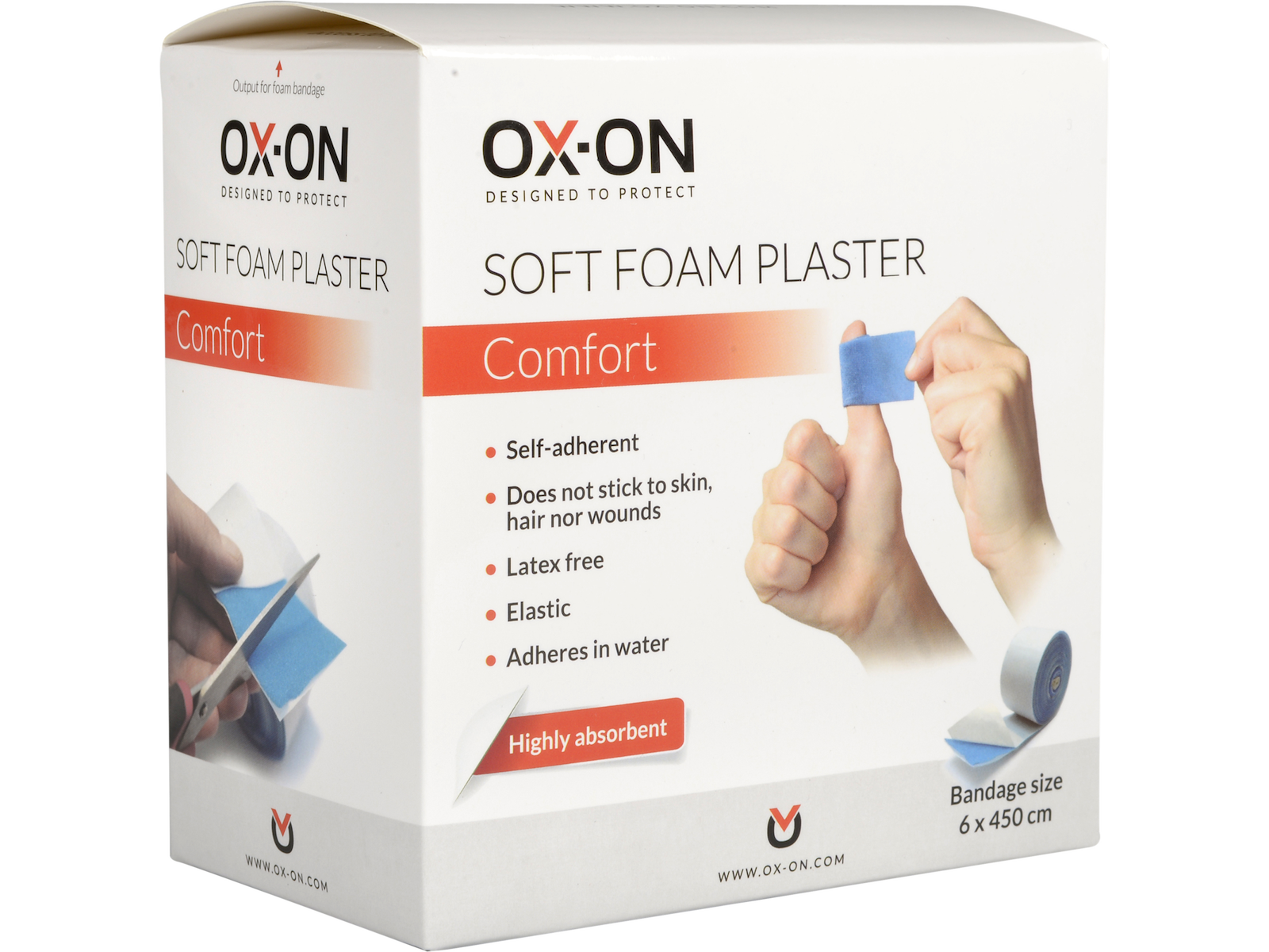 OX-ON Soft Foam Plaster Comfort is a hemostatic blue plaster in cross-elastic quality that ensures you good mobility over the joints. The blue color makes the plaster easy to spot and is recommended by the Danish Food Agency. The latex-free plaster is particularly skin-friendly, as it is adhesive-free and therefore does not stick to skin, hair or wounds. The plaster is self-adhesive and waterproof, so it can be used on both dry and wet skin. Does not stick to the skin and does not leave "fiber residues" in the wound and can therefore be placed directly on burns. A unique foam lining makes the plaster particularly suitable for bandaging fractures of toes, legs, arms and hands. Dimensions: Width: 6 cm Length: 4.5 m