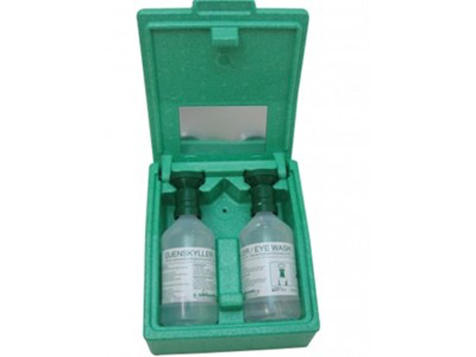 Eyewash station Plum with mirror + 2 x 500 ml bottles Dust-proof wall station in impact-resistant flamingo with 2 x 500 ml Plum Eyewash with sterile saline in the bottles. Particularly suitable for production areas with a lot of dirt and dust, as well as for mobile workplaces. Equipped with a pictogram on the front and a mirror inside the lid.
