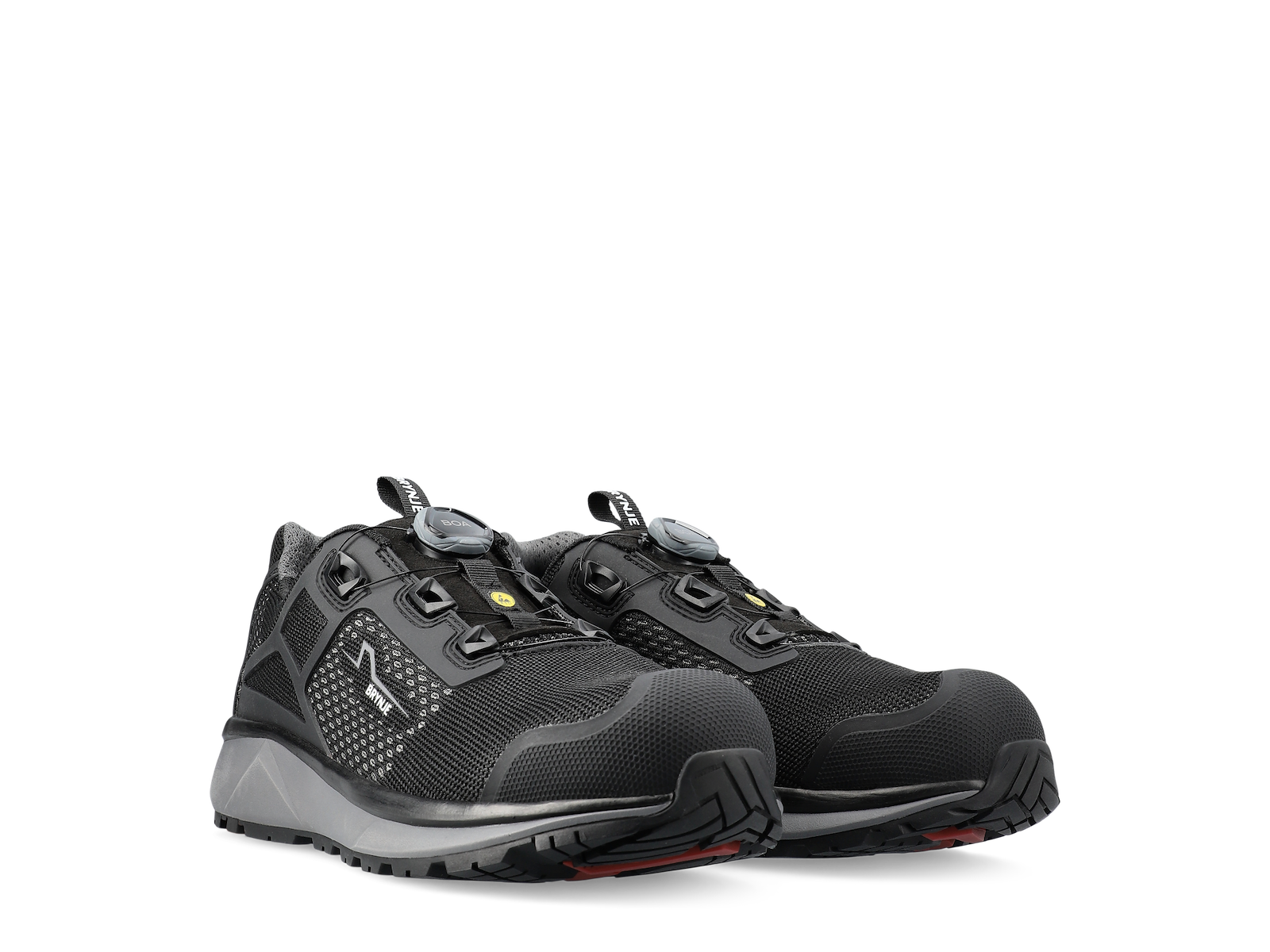 Smart and lightweight safety shoe certified according to the new standards in 2022. The upper consists of knitted, breathable polyester with elements in KPU for extra stability and strength. The fact that the upper is knitted provides a flexible fit and reduces waste in production. The shoe is even treated with a coating for a water-repellent effect. The shoe is tightened and loosened with the innovative BOA® Fit System, which provides a perfect fit. The ProNose made of KPU, a durable material, is approved according to the 2022 standard and is recommended for kneeling work. The rubber outsole is slip-resistant, and combined with a soft, shock-absorbing midsole in EVA, it makes for a comfortable and flexible shoe. The sole also consists of a shank that gives the shoe stability and reduces twisting and strain on the heel. The sole pattern is designed with large studs and wide grooves, so that soil, sand, water and mud can easily run off and provide good foothold. The insole is shock-absorbing, soft, flexible and breathable and consists of upcycled PU foam, which is foam residue from insole production. ESD-approved and PVC-free.