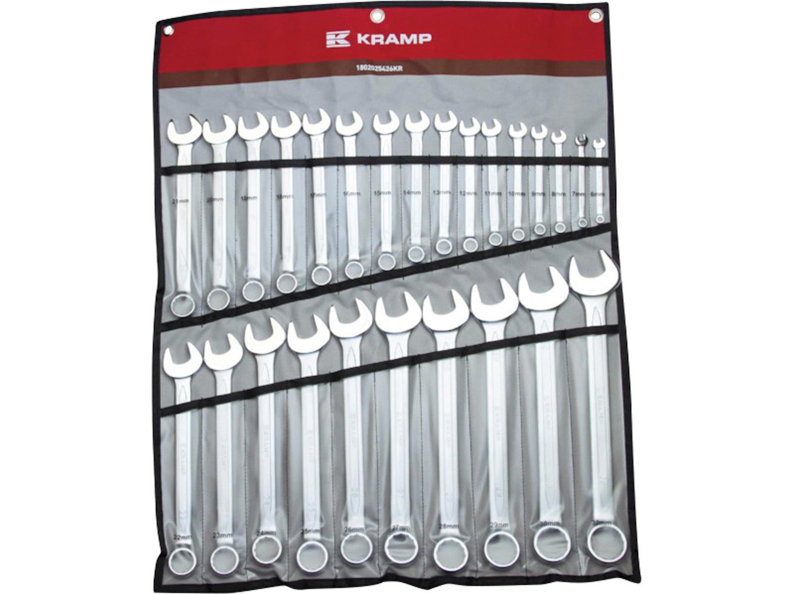 Ring spanner set, Kramp Grene ring fork wrench set with 26 keys Made in chrome vanadium. Matt finish. Supplied in roll folder. Contents: 6 - 7 - 8 - 9 - 10 - 11 - 12 - 13 - 14 - 15 - 16 - 17 - 18 - 19 - 20 - 21 - 22 - 23 - 24 - 25 - 26 - 27 - 28 - 29 - 30 & 32 mm.