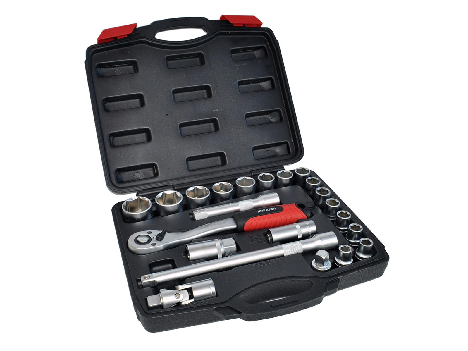 Socket wrench set, 1/2” 22 parts Kreator top wrench set in chrome vanadium steel and satin finish. Delivered in a case,