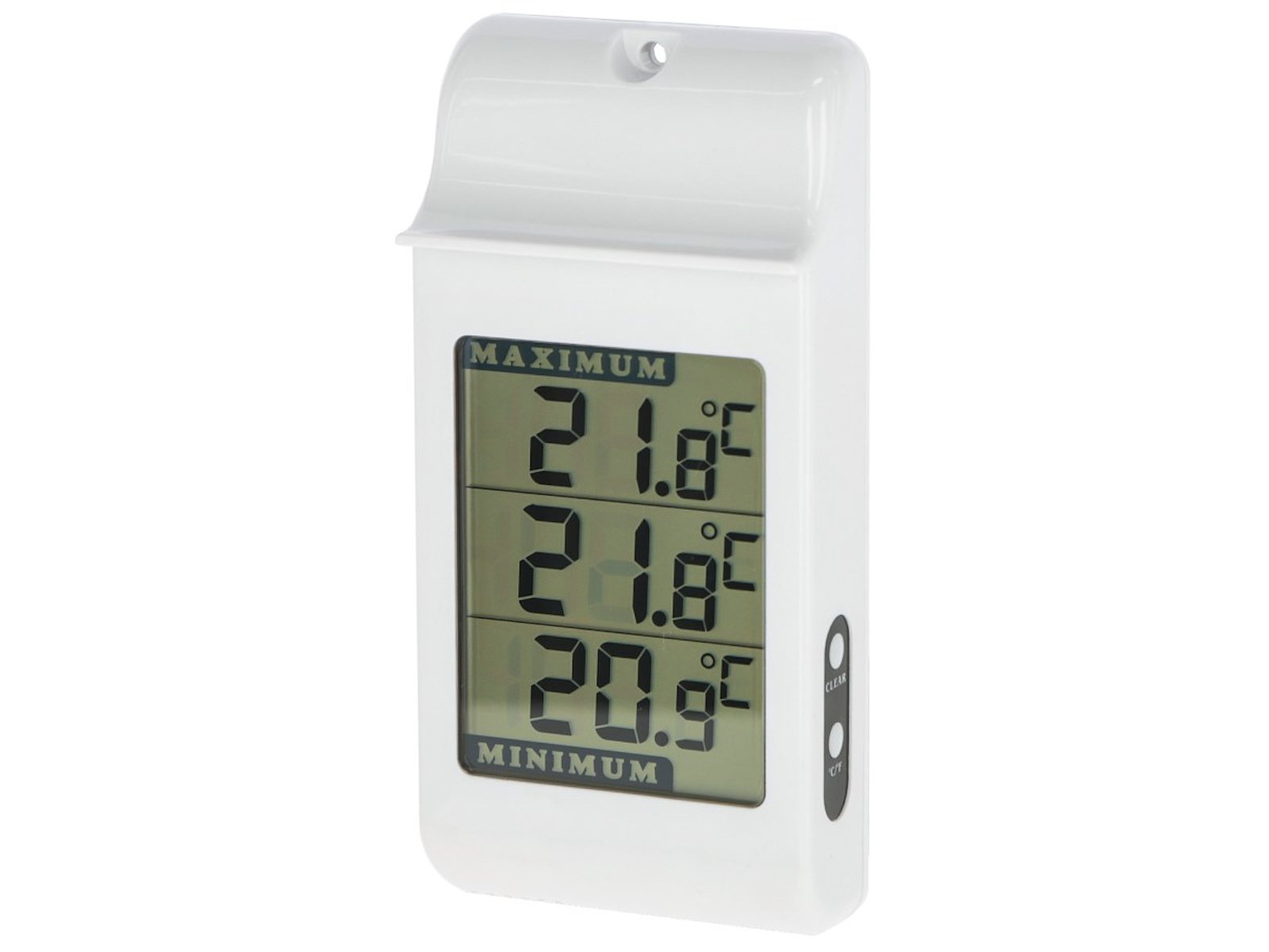 Easy-to-read thermometer shows the current temperature and the highest and lowest temperature reached since the last reset. Switch between °C and °F. Battery not included.