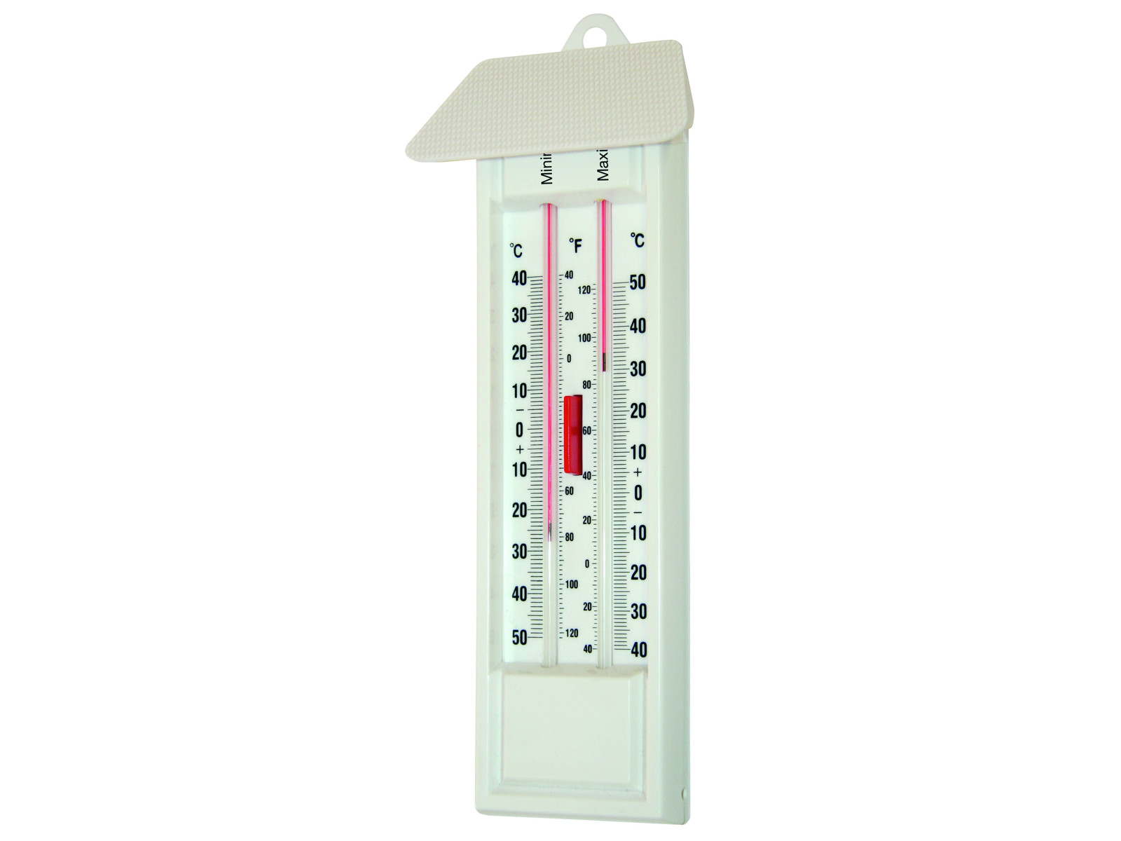 Thermometer Min/Max The thermometer must not lie horizontally. Does not contain mercury. Scale in Celsius and Fahrenheit.