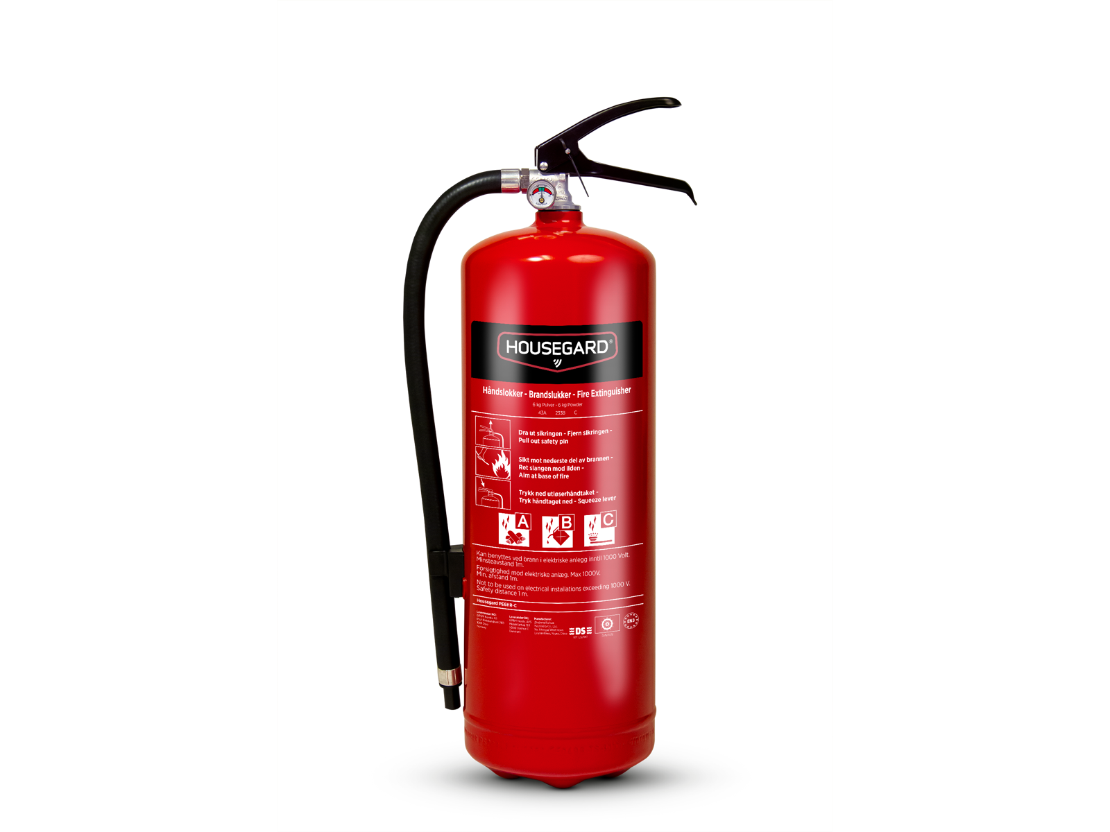 This means that you can extinguish larger fires than with most other powder extinguishers on the market, which often have a lower efficiency class. Housegard's powder extinguishers are quality assured and certified by DNV. Fire class: ABC.