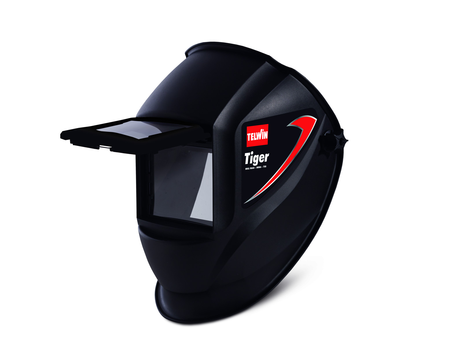 Welding helmet with tilting window Welding helmet with passive filter and lift-up system. Ideal for MMA, MIG-MAG and TIG welding. During welding, the operator simply lowers the adiactinic glass visor, while the transparent glass guarantees protection when the visor is raised, while grinding or using other power tools.